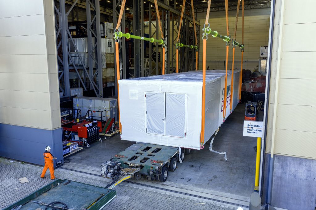 The journey: In Novi Sad Serbia, where the E-Houses were lifted and shipped to Rotterdam, accompanied by our gear. In Rotterdam, safely discharged with the Matador 3 (Bonn & Mees / HEBO) and stored at Condor Heavy Services, where we provided a full new lifting set including 4x MOD70H spreaders. Final destination, after final assembly works, the E-Houses were reloaded and transported to Shell Moerdijk.